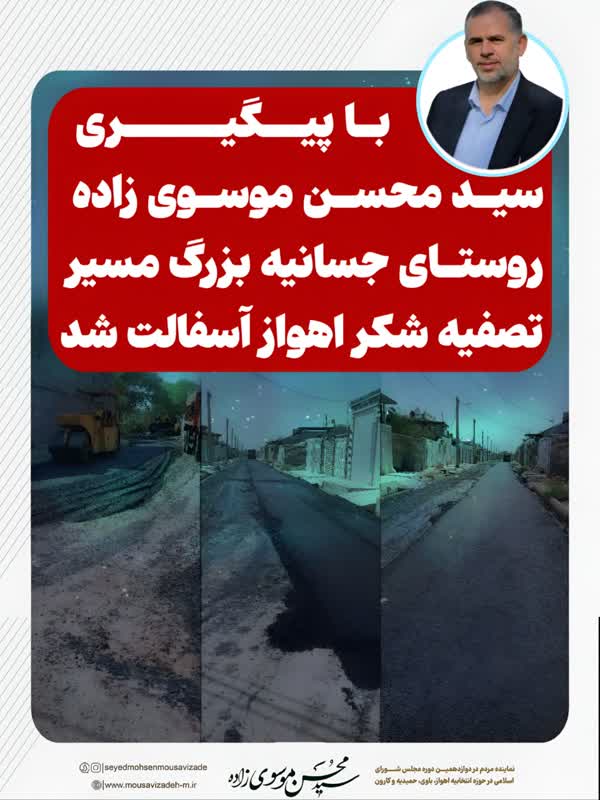 به گزارش روابط عمومی دفتر سید محسن موسوی زاده، عملیات آسفالت روستای جسانیه بزرگ مسیر تصفیه شکر از بخش مرکزی شهرستان اهواز با پیگیریهای سید محسن موسوی زاده نماینده مردم اهواز، کارون، باوی و حمیدیه در مجلس شورای اسلامی و بهره گیری از بخش مسئولیت های اجتماعی شرکت ها در دو مرحله، به ثمر نشست.