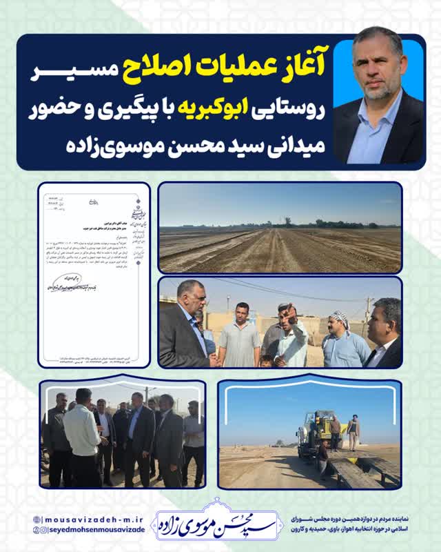 با پیگیریهای مستمر، حضور مکرر و مکاتبات سید محسن موسویزاده، نماینده مردم در مجلس شورای اسلامی، عملیات اصلاح مسیر روستای ابوکبریه و آمادهسازی زیرساختهای این روستا آغاز شد.