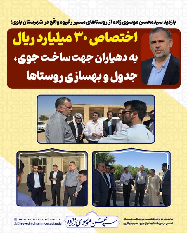 به گزارش روابط عمومی دفتر نماینده اهواز، باوی، حمیدیه و کارون در مجلس شورای اسلامی سید محسن موسوی زاده امروز به همراه فرماندار، رییس بنیاد مسکن و رییس اداره آبفا باوی از روستاهای مسیر رغیوه واقع در شهرستان باوی بازدید به عمل آورد.