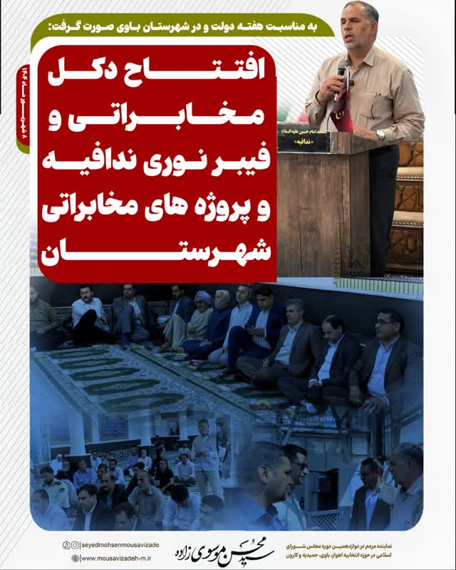 به مناسبت هفته دولت، دکل مخابراتی و پروژه فیبر نوری ندافیه از توابع شهرستان باوی، با حضور سید محسن موسویزاده نماینده مردم اهواز، کارون، باوی و حمیدیه در مجلس شورای اسلامی و مدیر شرکت مخابرات استان خوزستان به بهرهبرداری رسید.