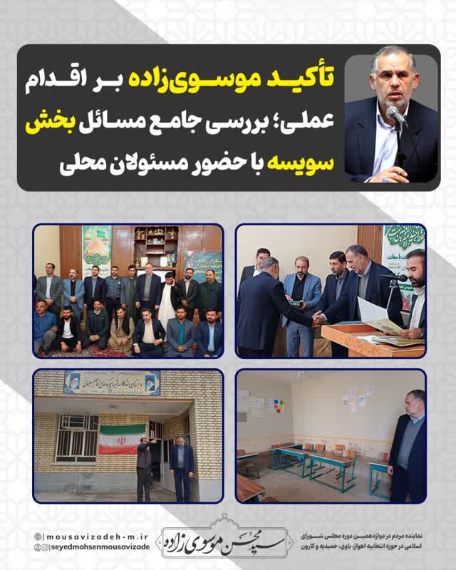 نشست بررسی مسائل و مشکلات بخش سویسه با حضور سید محسن موسوی‌زاده، نماینده مردم اهواز، باوی، حمیدیه و کارون در مجلس شورای اسلامی و جمعی از مسئولان محلی برگزار شد و مهم‌ترین مطالبات عمرانی و آموزشی این بخش مورد بررسی قرار گرفت.