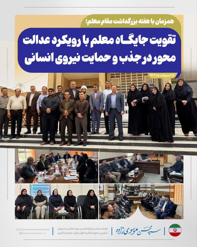 در حاشیه حضور سید محسن موسوی زاده در نواحی مختلف آموزش و پرورش ، بر ضرورت تقویت جایگاه معلم، جذب نیروهای توانمند بومی و استفاده از ظرفیت خیرین در مسیر توسعه آموزش و پرورش تأکید شد؛ در این مسیر، کمیسیون آموزش مجلس نیز همراه و پشتیبان وزارت آموزش و پرورش است. در این بازدید ها که به مناسبت روز معلم برگزارشد، سید محسن موسویزاده، نماینده مردم اهواز، کارون، باوی و حمیدیه در مجلس شورای اسلامی، آموزش و پرورش را محور پیشرفت کشور دانست و گفت: «تقویت معلم، یعنی تقویت آینده کشور؛ از همین رو همه دستگاهها و اقشار باید برای حمایت از این نهاد مهم پای کار بیایند.»