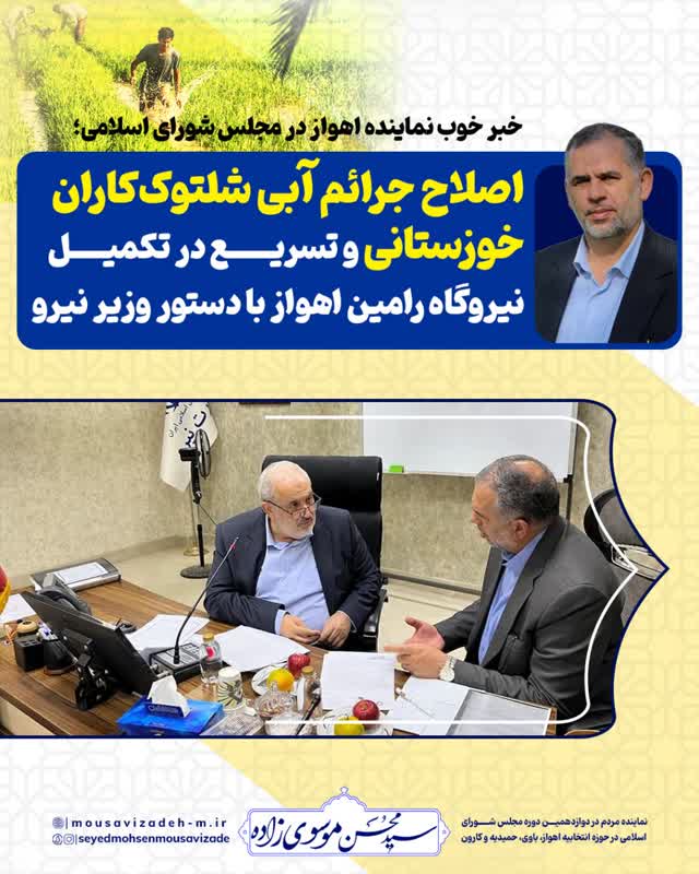 در پی دیدار سید محسن موسویزاده، نماینده مردم اهواز، کارون، باوی و حمیدیه با وزیر نیرو، گامهای مهمی برای توسعه زیرساختهای انرژی و حمایت از کشاورزان خوزستانی برداشته شد؛