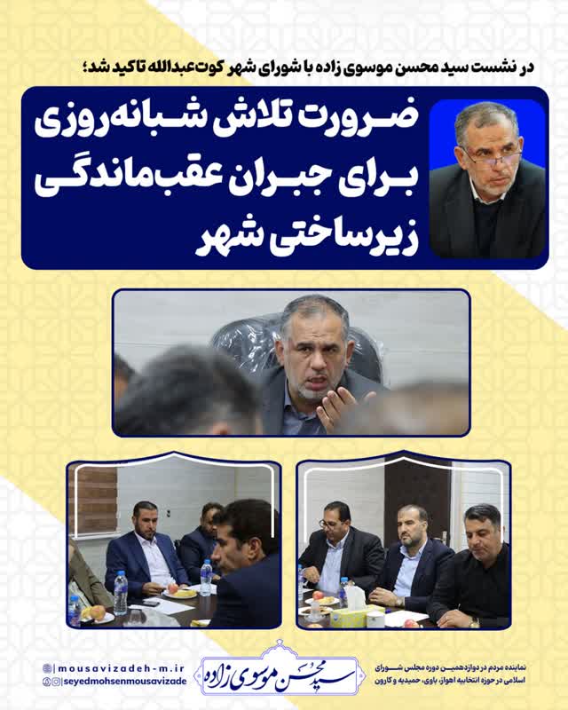 سید محسن موسویزاده در این نشست با اشاره به مشکلات زیرساختی شهر کوتعبدالله اظهارکرد: کوتعبدالله از زمان جدا شدن از کلانشهر اهواز، از بسیاری از امکانات اولیه شهری محروم بوده و همین امر موجب شده تا امروز با کمبودهای فراوانی مواجه باشد؛ حجم کار فراوان و برای جذب اعتبارات، به معنای واقعی کلمه باید جنگید.