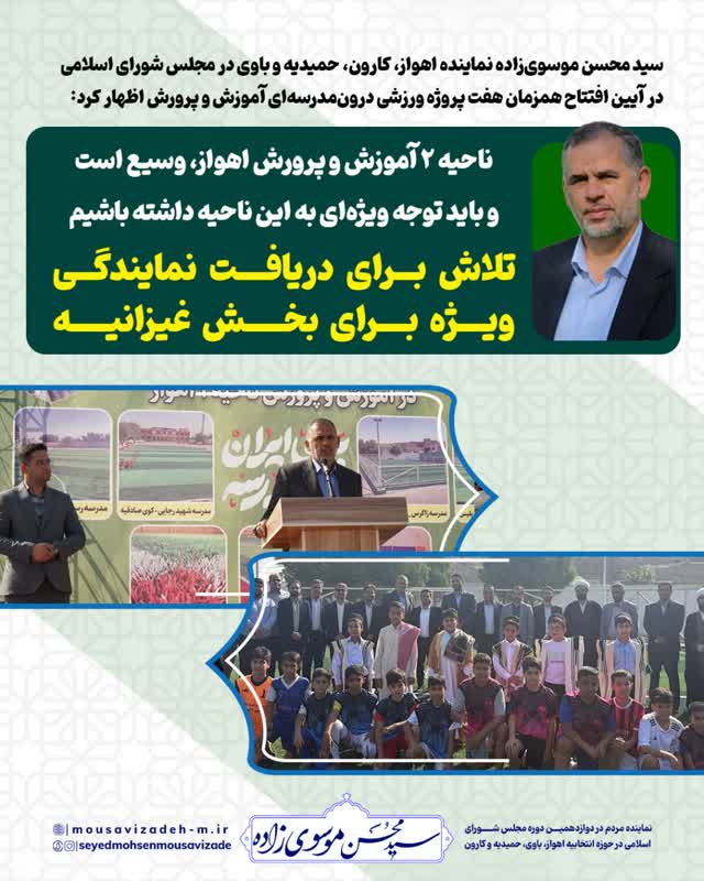 شایان ذکر است امروز زمین چمن مصنوعی در قالب طرح همدلی آموزش و پرورش ناحیه ۲ در مدرسه مهاجرین منبع آب اهواز با حضور موسوی زاده و مدیران استانی و شهرستانی افتتاح شد.