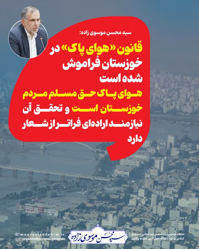سید محسن موسویزاده با اشاره به ۲۹ دیماه روز هوای پاک، نسبت به آلودگی شدید هوای خوزستان در سال جاری هشدار داد و اظهار کرد: اقدام فوری همه دستگاههای مسئول برای اجرای واقعی «قانون هوای پاک» ضروری است.