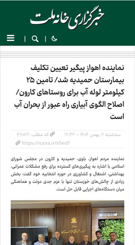 نماینده اهواز پیگیر تعیین تکلیف بیمارستان حمیدیه شد/ تامین ۲۵ کیلومتر لوله آب برای روستاهای کارون/ اصلاح الگوی آبیاری راه عبور از بحران آب است