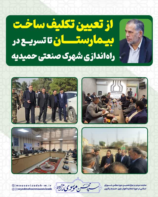 پیگیریهای میدانی سید محسن موسویزاده برای توسعه زیرساختهای درمانی و صنعتی حمیدیه از تعیین تکلیف ساخت بیمارستان تا تسریع در راهاندازی شهرک صنعتی حمیدیه
