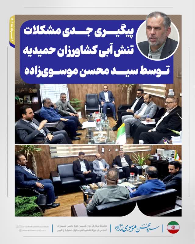 در پی گزارشهای متعدد از سوی کشاورزان شهرستان حمیدیه درباره مشکلات ناشی از تنش آبی، نماینده مردم اهواز، حمیدیه، کارون و باوی در مجلس شورای اسلامی پیگیری این موضوع را در دستور کار جدی خود قرار داد. در واکنش به گزارشهای دریافتی از کشاورزان شهرستان حمیدیه پیرامون بحران کمآبی و چالشهای موجود در بخش کشاورزی، اعضای دفتر سید محسن موسویزاده، نماینده مردم شریف اهواز، حمیدیه، کارون و باوی در مجلس شورای اسلامی، با حضور در فرمانداری این شهرستان، نشستی با سرپرست فرمانداری، بخشدار مرکزی، رئیس اداره کرخه و شاوور و رئیس جهاد کشاورزی شهرستان حمیدیه برگزار کردند.