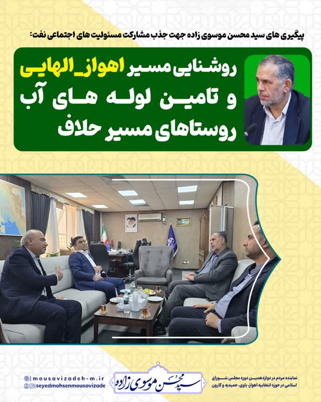 در جلسه سید محسن موسوی زاده با دکتر پیرامون مدیرعامل شرکت ملی مناطق نفت خیز جنوب ضمن قدردانی از همکاری در محرومیت زدایی در قالب مسئولیت های اجتماعی در حوزه انتخابیه (مسیر خسرج، جاده اهواز و حمیدیه و…) خواستار مشارکت در روشنایی مسیر اهواز_الهایی و تامین ۸ کیلومتر لوله های آب شرب ۱۶ اینچ جهت روستاهای مسیر حلاف شد.