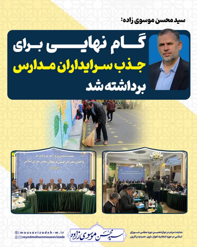 با تلاشها و پیگیریهای مستمر سید محسن موسویزاده و اعضای کمیسیون آموزش مجلس شورای اسلامی، روند جذب سرایداران مدارس پس از سالها وقفه وارد مرحله نهایی شد. دفترچه اولیه آزمون استخدامی تهیه و برای تأیید نهایی به سازمان امور اداری و استخدامی ارسال شده است.