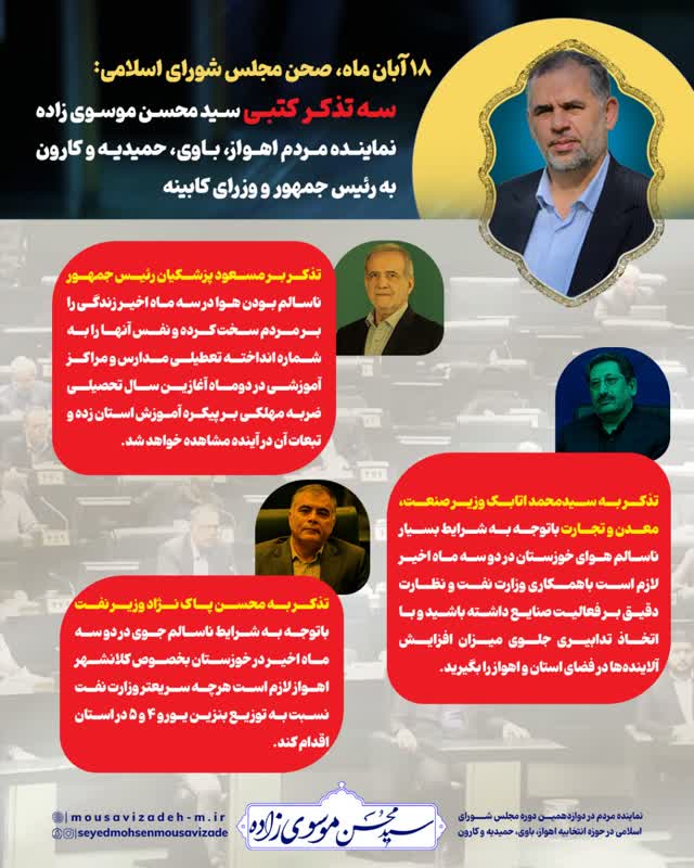 صحن مجلس شورای اسلامی سه تذکر کتبی سید محسن موسوی زاده نماینده مردم اهواز، باوی، حمیدیه و کارون به رئیس جمهور و وزرای کابینه